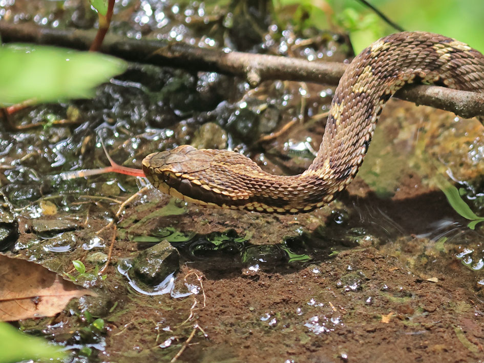 写真は左右とも同じ個体。有毒のヘビの頭部は三角形に見えると言われるが無毒のヘビでも三角形に見えることがある。