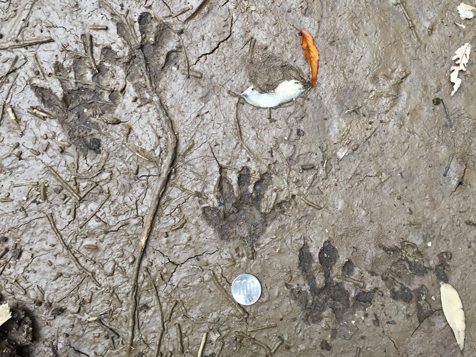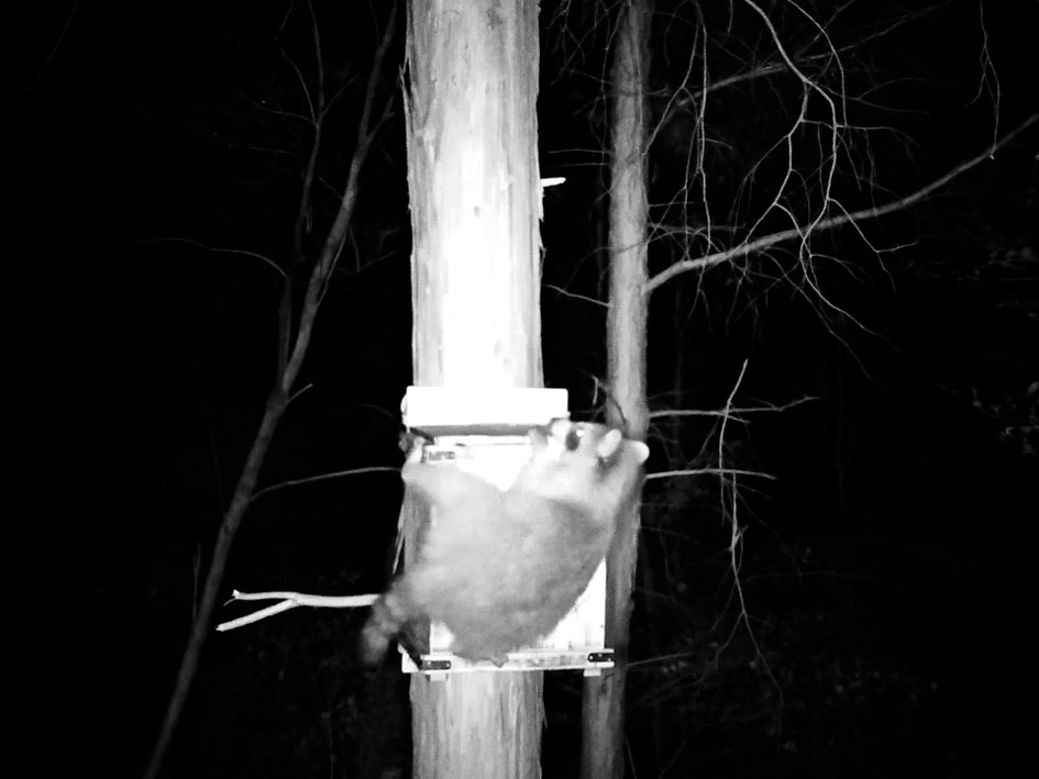 写真左はアライグマが地上5m付近に設置したムササビ用の巣箱に前脚を突っ込み、中にいるムササビを捕食しようとしている場面。右は烏帽子形公園で撮影されたアライグマの足跡。長い指が特徴的。