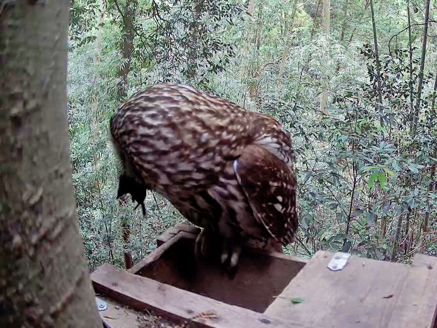 写真左は府営長野公園延命寺地区の園路上で撮影したもの。右はフクロウが巣内のヒナに餌として与えるためヒミズを嘴に咥えて持ち帰ったところ。尖った鼻先とブラシ状の短い尾でヒミズと判定している。